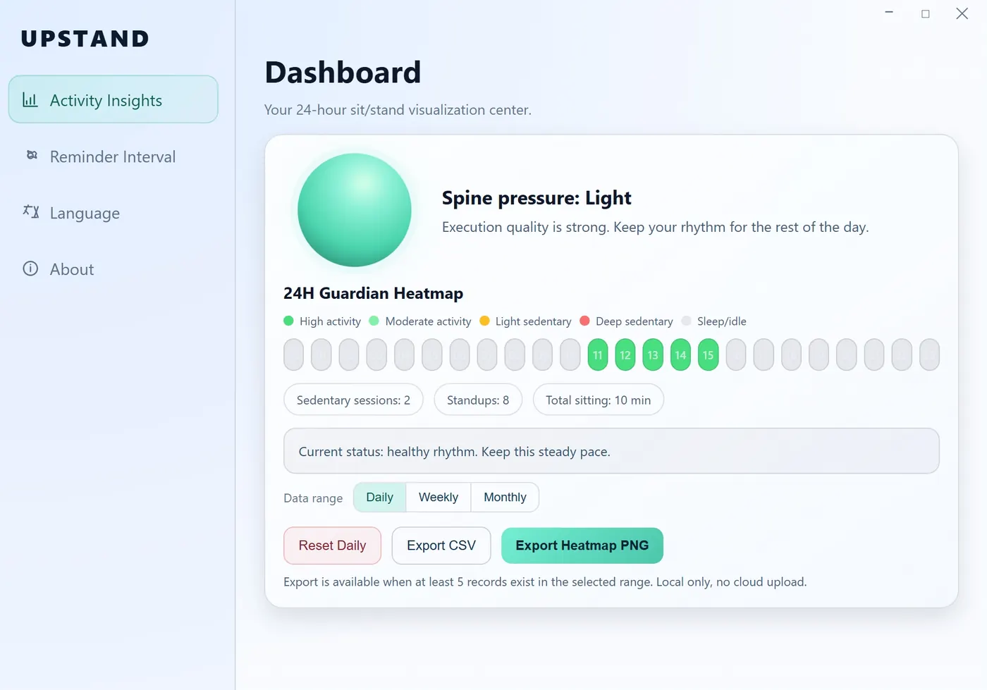 Upstand keeps your work rhythm healthy with gentle reminders, clean analytics, and local export flows that keep your data on device.